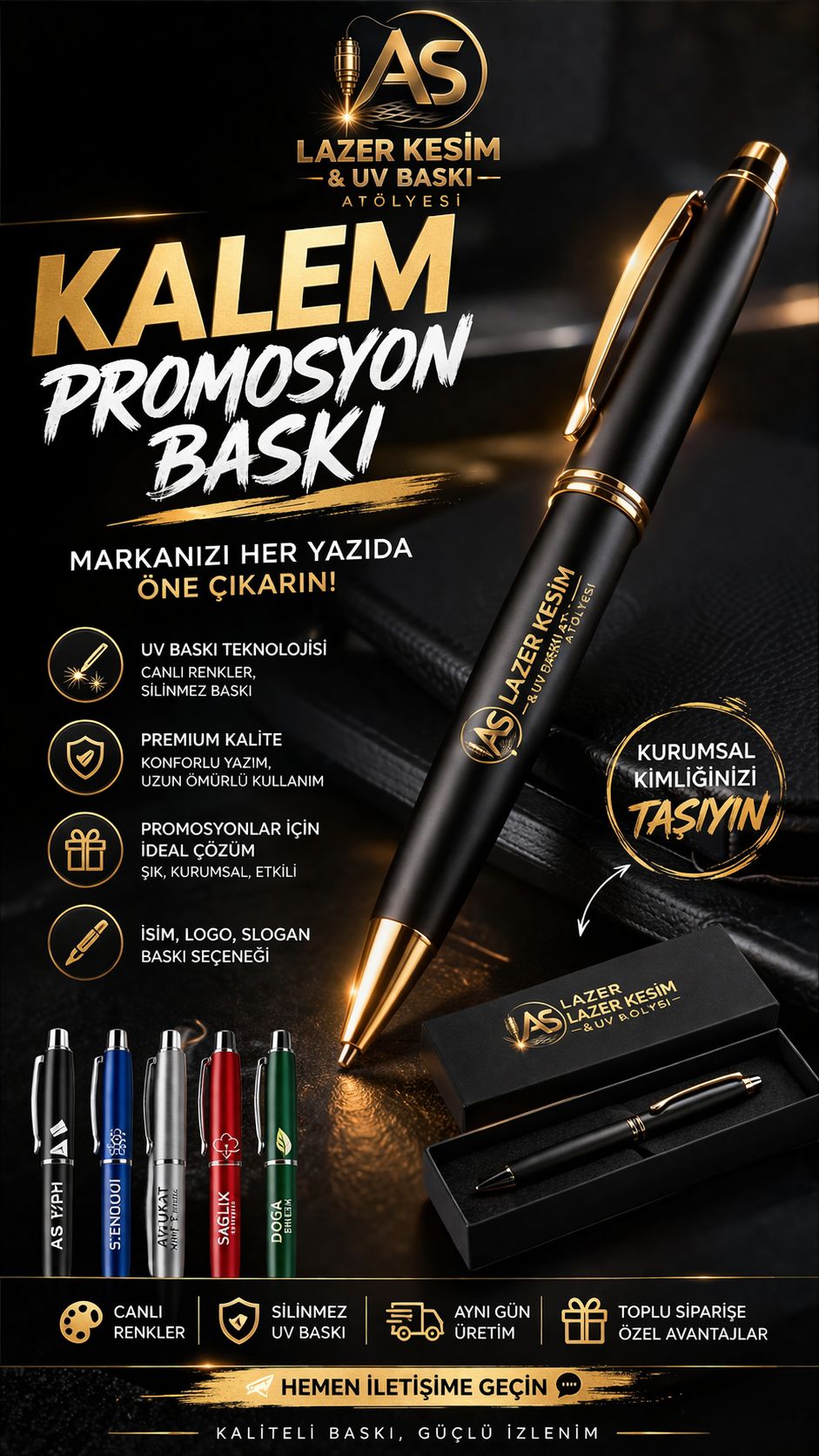 ✒️ Promosyon Kalem Markanız Her Yazıda Yer Alsın! Günlük hayatta en çok kullanılan promosyon ürünlerinden biri olan kalemler, markanızı sürekli görünür kılar. UV baskı veya lazer baskı ile hazırlanan tasarımlar kalıcı, şık ve profesyonel bir etki oluşturur.